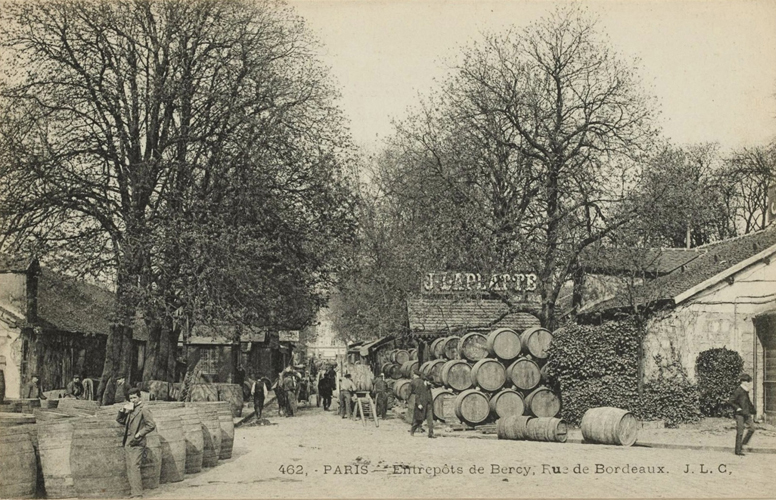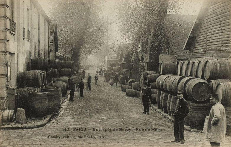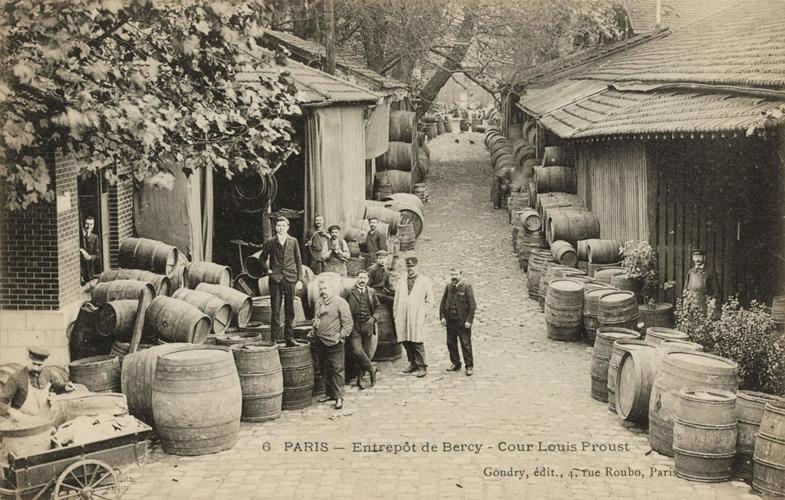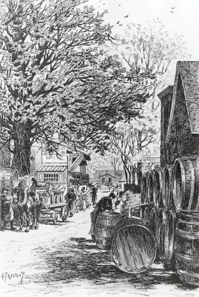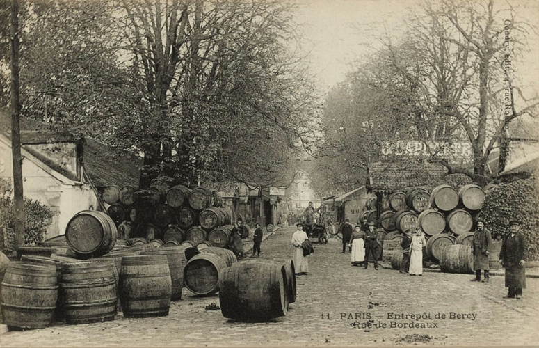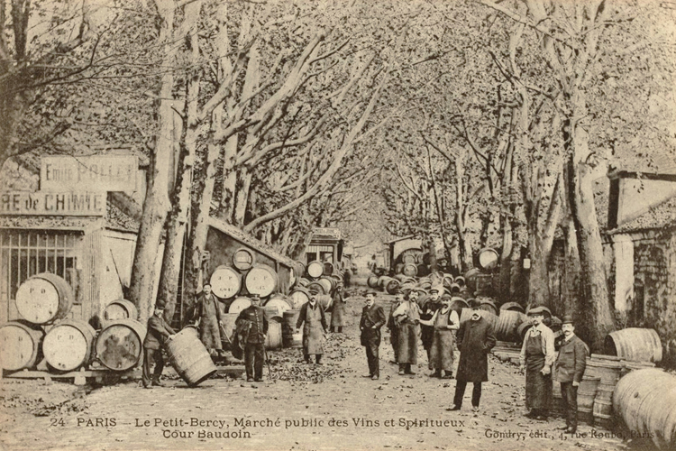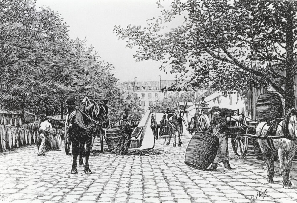 « À peine a-t-on franchi l’ancienne barrière de La Râpée, qu’on aperçoit de tous côtés sur le quai qui manque de largeur, de longues files de tonneaux symétriquement rangées sur les berges, ou voiturés sur des haquets (sorte de charrette étroite et longue utilisée pour le transport des tonneaux) ou autres véhicules.Il faut avoir été témoin de l’animation qui règne en semaine sur ce quai, pour pouvoir s’en faire une idée. Ce ne sont que négociants, courtiers, commis, allant, venant, munis de leurs inséparables outils, tasses d’argent, pince et foret, occupés ceux-ci à faire charger le liquide, ceux-là à le faire goûter aux clients qui, en leur qualité d’acheteurs, affectent de toujours trouver le prix de la marchandise trop élevé …