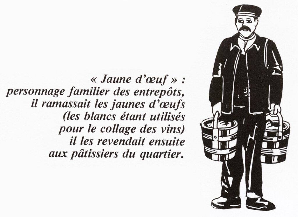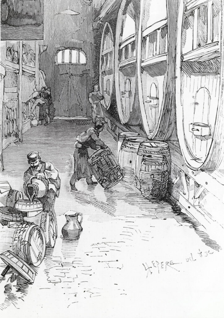 « Représentez-vous un mouvement perpétuel de voitures, deux lignes de petits bureaux, d’innombrables fûts pleins ou vides de toutes contenances, dispersés çà et là, et gerbés en bouquets. Les travailleurs sont à l’heure, avec la grande blouse, la cotte et le grand tablier bleu de forte toile ou de cuir. Ils remplissent ou préparent les pièces que les voituriers vont charger… rincent les futailles en faisant rouler dans le ventre des douves une chaîne en fer, introduisent la mèche de soufre devant leur ôter le mauvais goût, et collent les vins pour les clarifier. Et puis, c’est le maillet du tonnelier qui retentit sur les futailles…