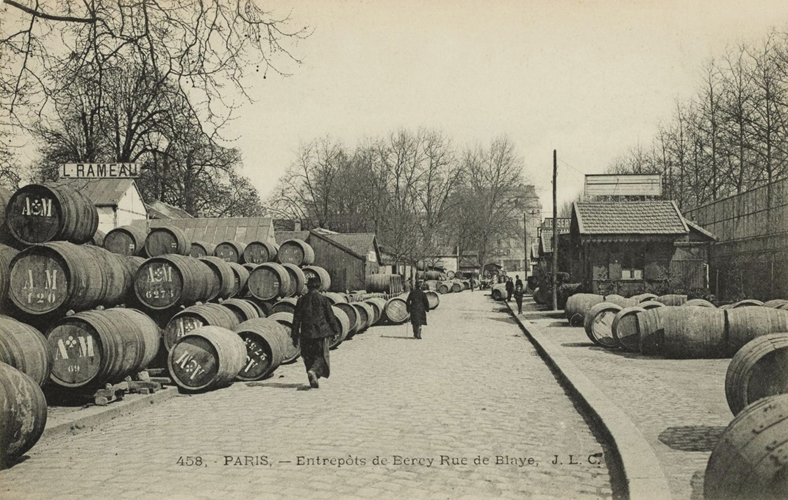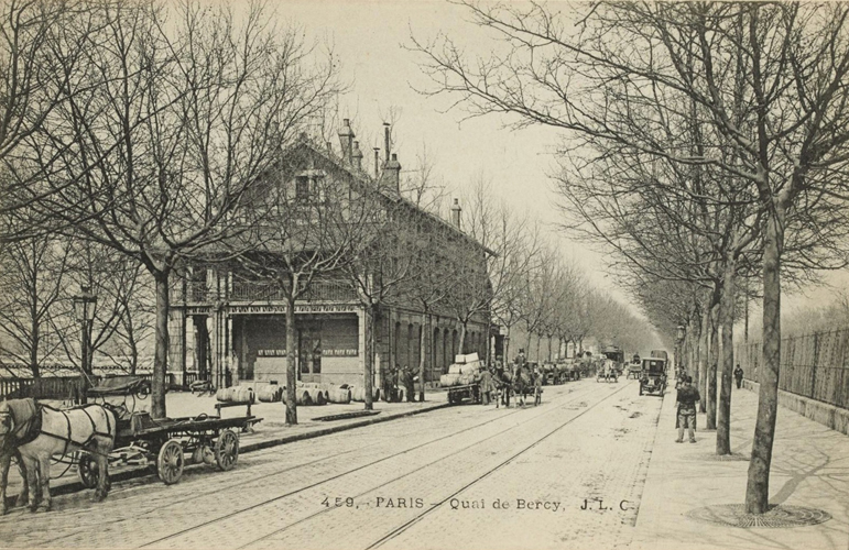 En se promenant aujourd’hui sur la terrasse dominant la voie sur berge ou sur les gradins extérieurs du Centre Accord-Arena, on a du mal à imaginer l’effervescence qui régnait aux XIXe et XXe siècles le long du quai et dans les rues occupées aujourd’hui par le paisible parc de Bercy.
