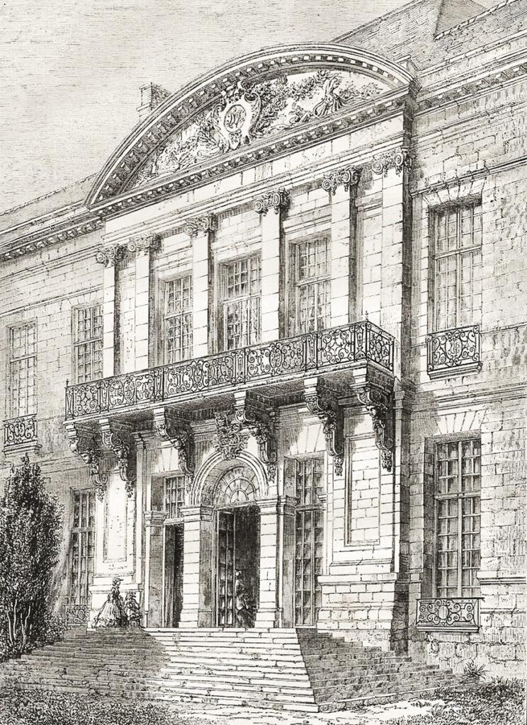 « Cette distribution définitive, qui subsista jusqu’au dernier jour, comprenait : un rez-de-chaussée, le vestibule et le grand salon, dit improprement salles des Gardes, tous deux de proportions monumentales, l’un en pierre sculptée, l’autre orné de quatre immenses peintures historiques, un salon de musique, un grand cabinet d’assemblée, un petit salon, une salle à manger et son office, trois autres pièces à l’ouest et une salle de spectacle avec foyer qui fut primitivement la salle de billard ; au premier étage, la grande bibliothèque et la petite, et onze pièces disposées à droite et à gauche d’une galerie centrale. »