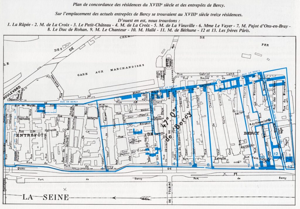 Cette résidence joua, rappelons-le, un grand rôle, lors de la constitution des futurs entrepôts de Bercy lorsque M. de Chabons acquit ce domaine en 1807. Il adressa au Gouvernement Impérial un mémoire accompagné d’un plan, afin de persuader les pouvoirs publics d’installer, à partir de ce qui existait, les futures halles aux vins, dont on projetait la construction sur les terrains de l’abbaye Saint-Victor. Le pouvoir d’alors refusa cette suggestion, préférant un entrepôt dans Paris.